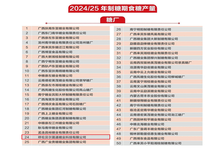 11月1日,中國糖業(yè)協(xié)會(huì)發(fā)布了2024/25年制糖期全國制糖企業(yè)(集團(tuán))、糖廠的生產(chǎn)情況,呼倫貝爾安琪晟通糖業(yè)科技有限公司以11.3萬噸的產(chǎn)糖量,位列全國糖廠第24位、甜菜糖廠首位。2024年,晟通公司深化與呼倫貝爾農(nóng)墾集團(tuán)合作...